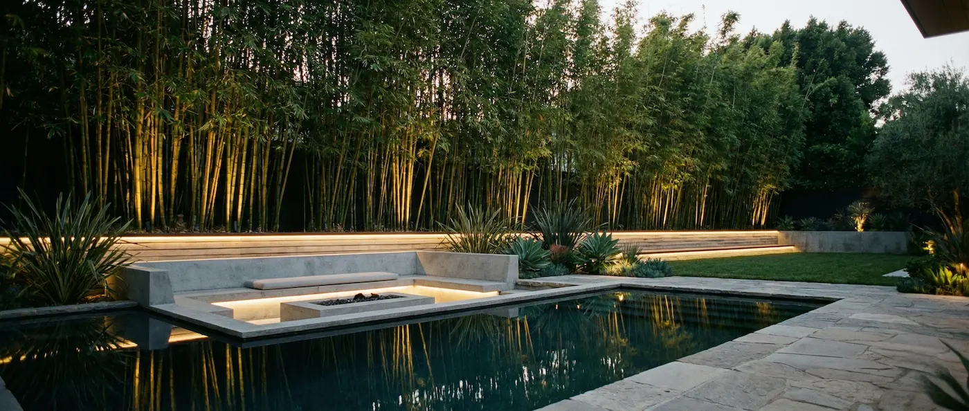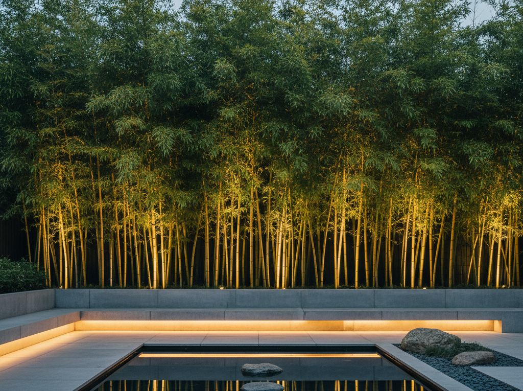 Vista panorámica 21:9 de jardín moderno con bosque de bambú iluminado al anochecer.