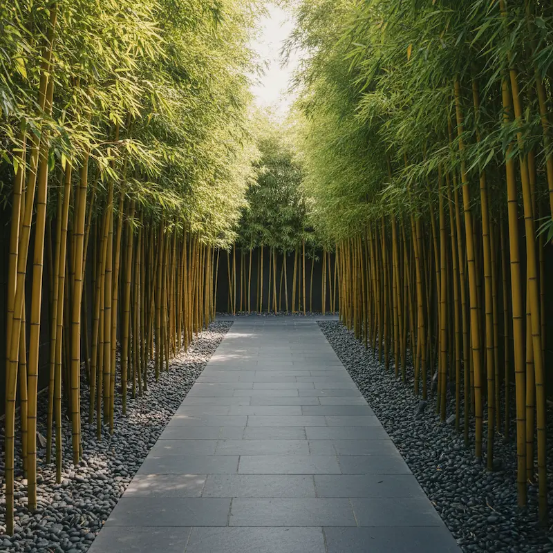 Camino de jardín minimalista flanqueado por bambúes amarillos y grava de pizarra.