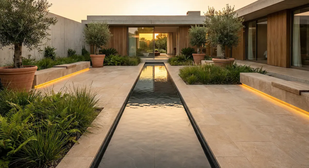 El secreto técnico: En lugar de estanques profundos, la tendencia es diseñar canales estrechos y superficiales (láminas de agua) revestidos en materiales nobles como el acero corten o la pizarra oscura. Al hacer que el agua quede a ras del pavimento, logramos que actúe como un espejo inmenso que refleja el cielo y la luz. ¿El resultado visual? Tu jardín o terraza engañará al ojo y parecerá automáticamente mucho más amplio y ordenado.
