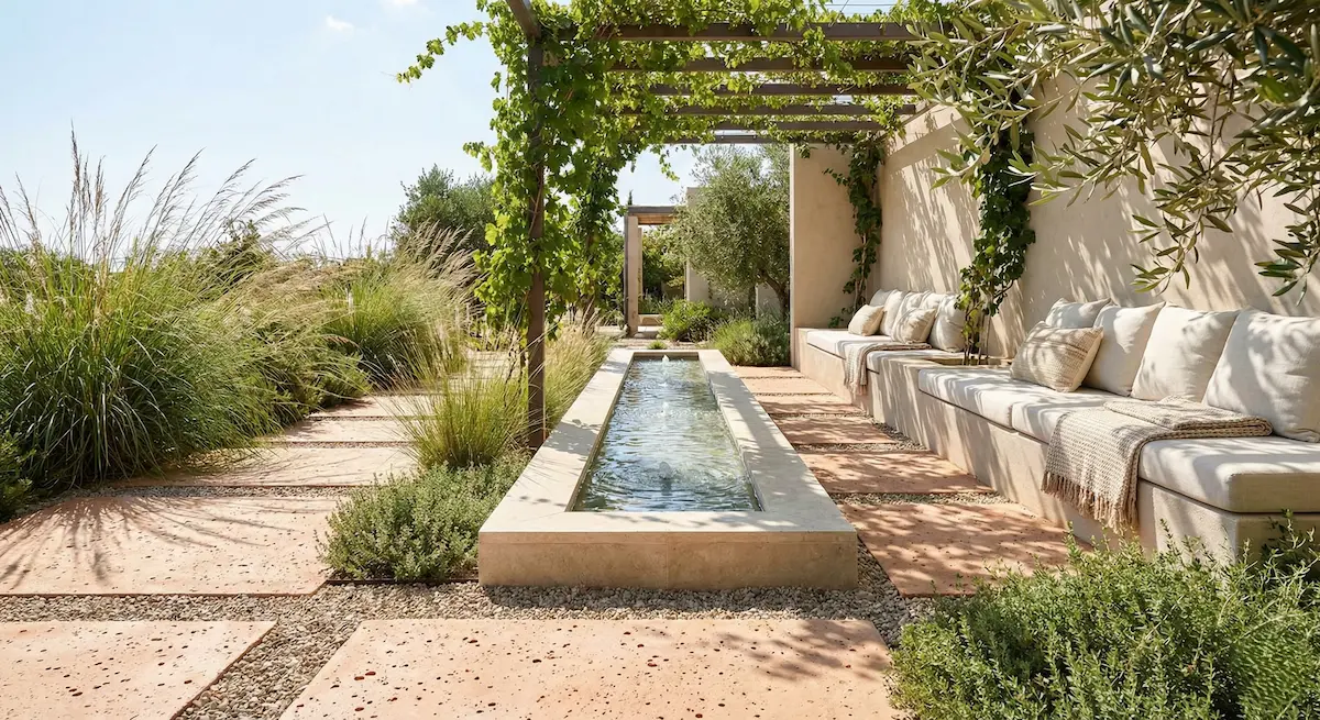 El secreto técnico: El agua en movimiento, combinada con la más mínima brisa, genera un efecto llamado «refrigeración evaporativa». Si sitúas una lámina de agua cerca de tus zonas de descanso y utilizas pavimentos porosos en ciertas áreas, conseguirás bajar la temperatura térmica del patio varios grados de forma 100% natural. Es climatización ecológica, silenciosa y bellísima.