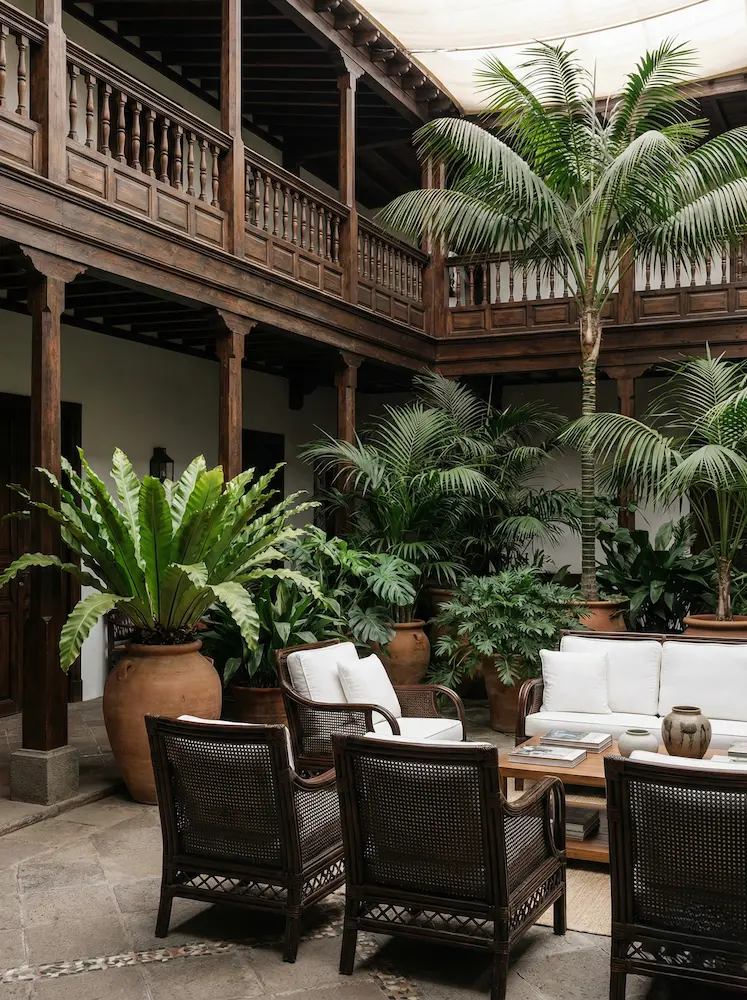 Rodeado de galerías de madera sostenidas por gruesos pilares, el patio se convierte en un invernadero a cielo abierto. Aquí, las plantas de sombra más delicadas, como los nidos de ave (Asplenium nidus) o las kentias, se cultivan en grandes macetones de terracota. Decorado con sobrios muebles de ratán oscuro y lino blanco, el patio canario es el santuario definitivo para leer y resguardarse en los días más calurosos del verano.