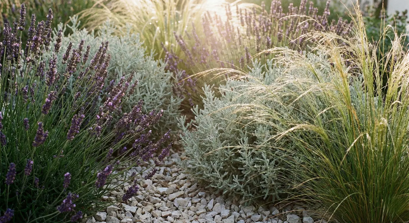 - Stipa tenuissima: Gramínea que aporta movimiento y un aspecto pajizo muy valorado en el minimalismo cálido.