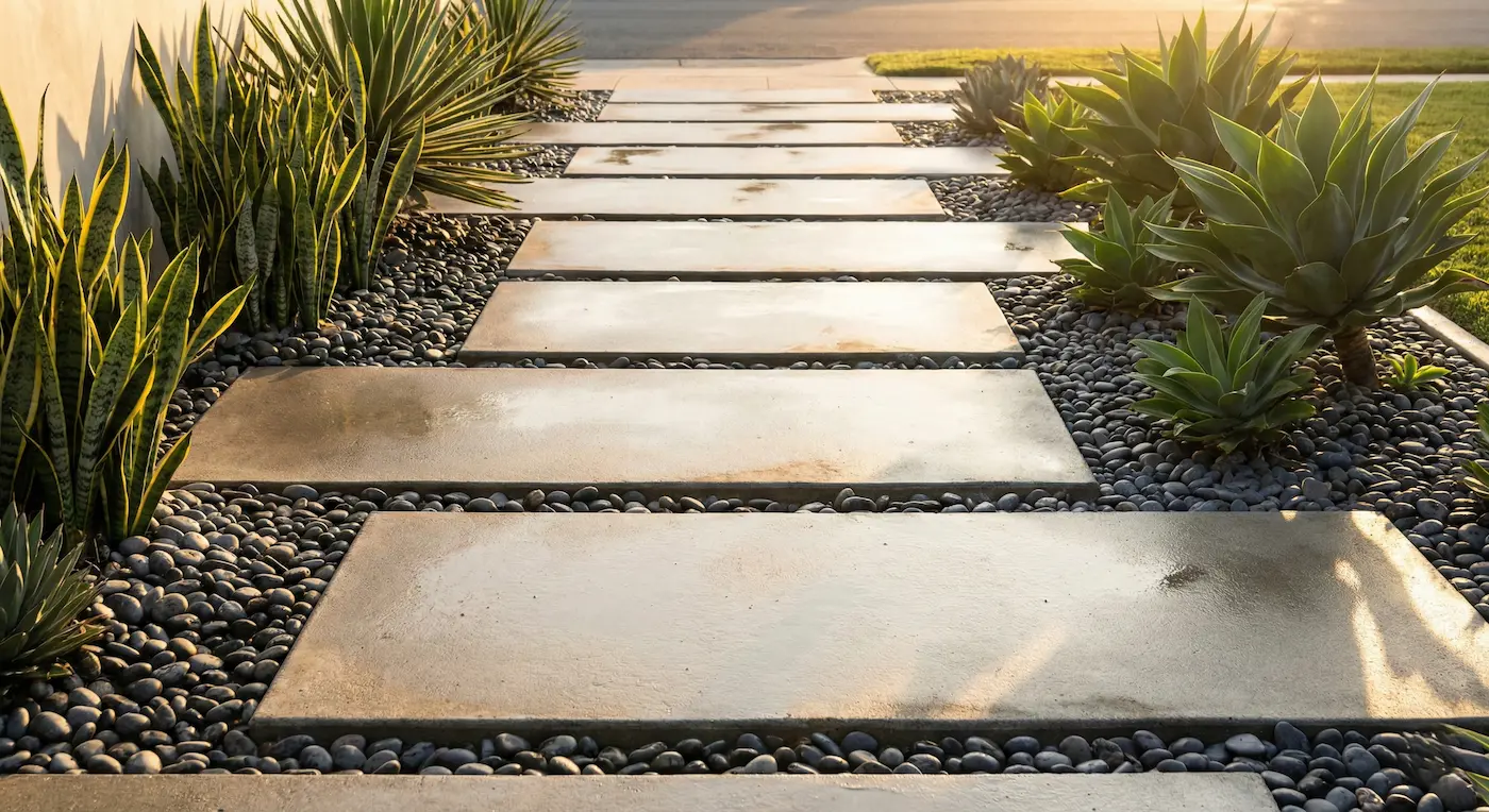 La creación de grandes losas de hormigón que parecen flotar sobre una cama de grava o agua es un recurso recurrente en el paisajismo premium. Aporta una ligereza visual sorprendente a un material tan masivo.