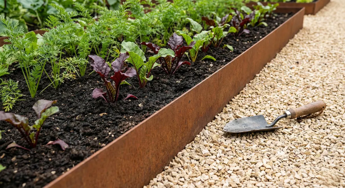 Un huerto de alta costura no se planta a ras de suelo en un terreno irregular. La clave del éxito visual reside en elevar la plantación y enmarcarla utilizando materiales arquitectónicos contundentes.
