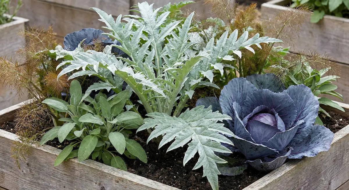 No plantearemos simples lechugas en línea recta. Jugaremos con los volúmenes arquitectónicos: las impresionantes hojas plateadas de la alcachofa o el dramatismo oscuro de la col lombarda actúan como puntos focales. A sus pies, integramos flores comestibles como las capuchinas o las caléndulas, que aportan toques vibrantes de naranja y amarillo. Y como remate perimetral, masas de lavanda y romero, que no solo perfuman el ambiente y atraen a los polinizadores, sino que unifican el diseño con el resto del jardín mediterráneo.