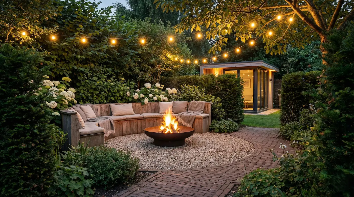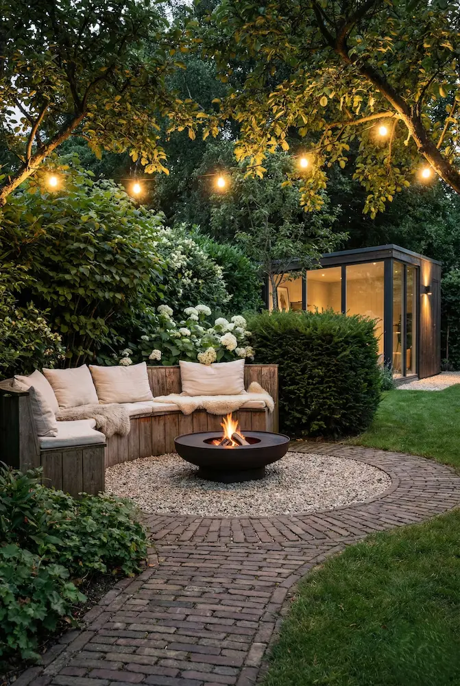 El corazón social de este jardín nocturno no es una mesa de comedor formal, es el fuego. Esta zona está diseñada para la desconexión y la intimidad. La transición de materiales es clave para marcar el cambio de ritmo: el camino de ladrillo antiguo desemboca en una zona de grava crujiente, un material permeable y relajado que define el área de estar.