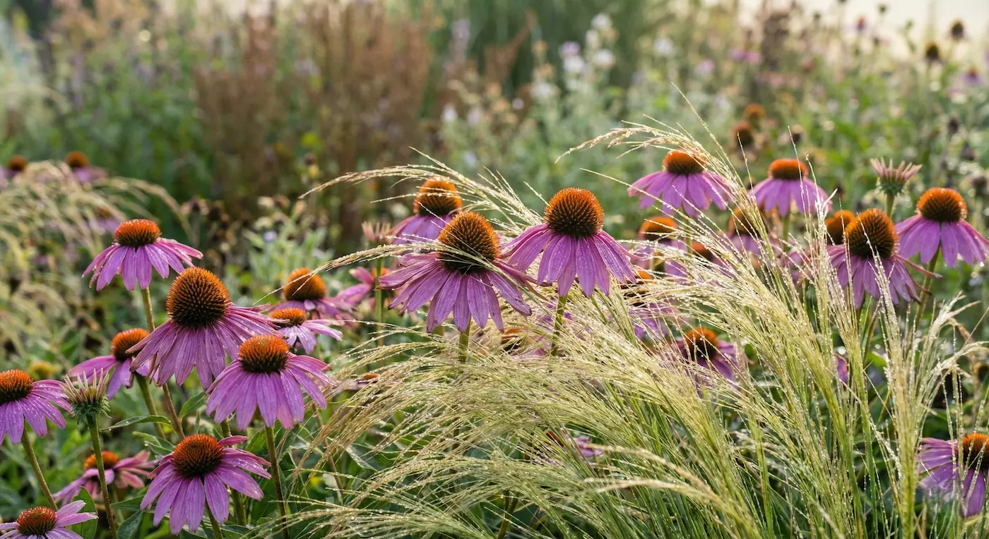 Aunque las gramíneas son protagonistas, las flores perennes de larga duración son las que aportan los toques de color y atraen la vida al jardín. La combinación busca una estética natural, no un estallido de color forzado.