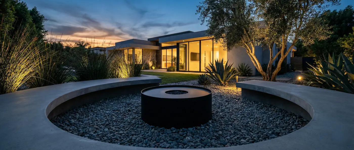 Un solo elemento de fuego (fire pit) de líneas puras o una lámina de agua negra sin rebosadero visible puede articular todo el espacio exterior, convirtiéndose en el corazón social del jardín.