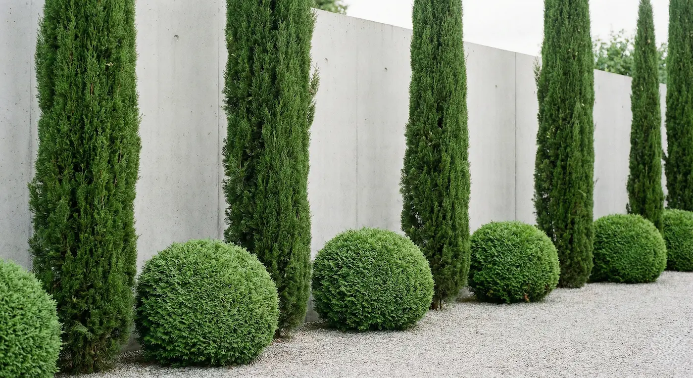- Thuja ‘Danica’ o ‘Tiny Tim’: Esferas naturales que aportan un ritmo geométrico suave sin necesidad de poda constante.