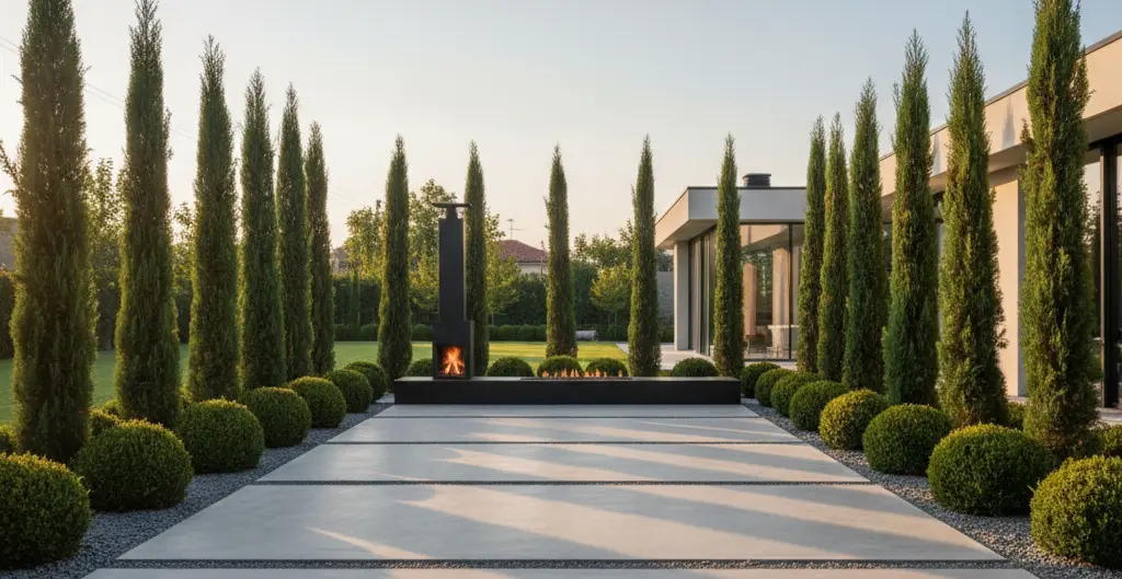 - Cupressus sempervirens ‘Stricta’: Utilizados en grupos de tres o en hileras para marcar una verticalidad absoluta y limpia.