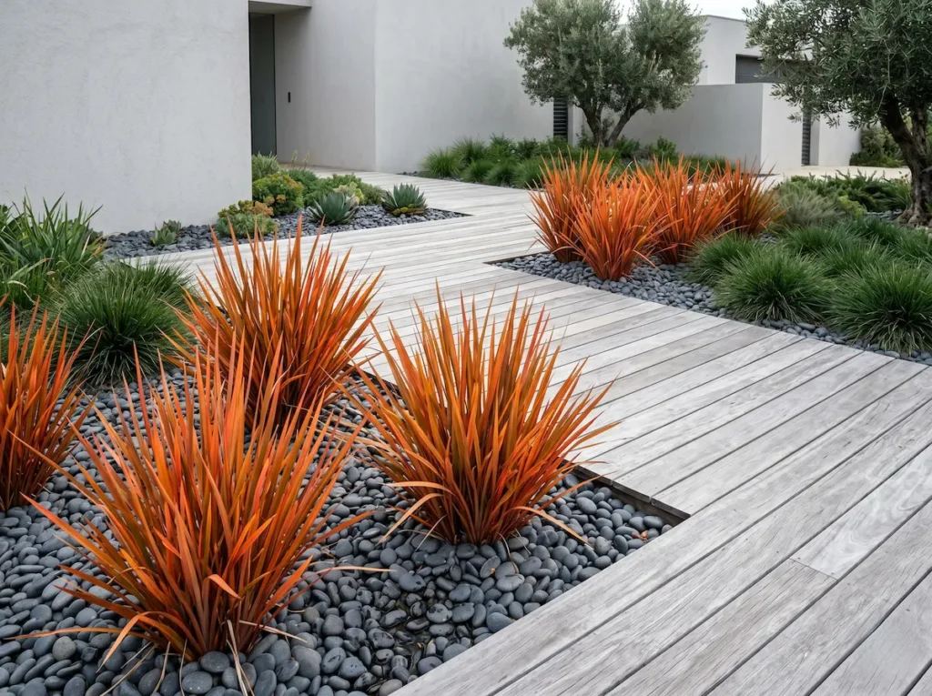 Su máxima expresión se alcanza mediante una integración paisajística concebida desde el contraste material. Al situar sus matas cobrizas sobre un lecho de grava de basalto negro, o flanqueando elementos de madera natural envejecida, la planta establece una conexión tectónica impecable. Esta sinergia entre el elemento botánico y el mineral u orgánico consolida un patrimonio verde robusto, donde cada línea de diseño está justificada y el espacio respira una atmósfera de excelencia sostenida.